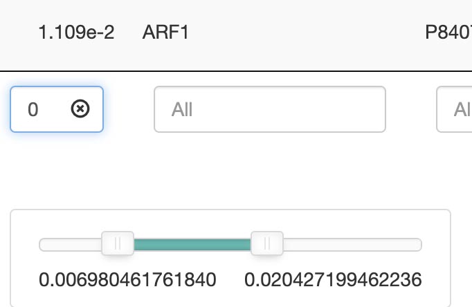 Use the the search tool in the top right to easily find what you are looking for. The search tool enables you to quickly locate specific items within your data using keywords like identifiers (e.g., O075475), fold change (e.g., 0.90), p-values (e.g., 7.606e-60), and more.