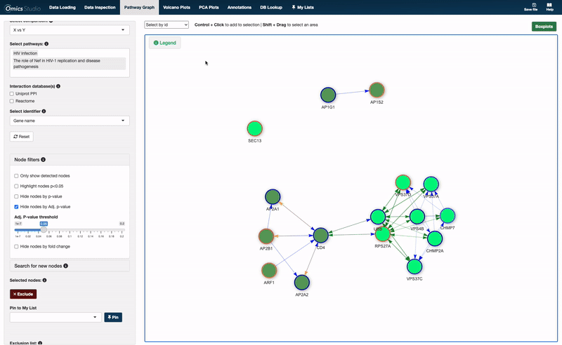 Pin to My ListSave your selected nodes to "My List" for easy access and further analysis.ExcludeSimplify your graph by removing unnecessary connections between nodes.BoxplotsGenerate boxplots for selected nodes to analyze their statistical distributions and compare across different conditions or groups.