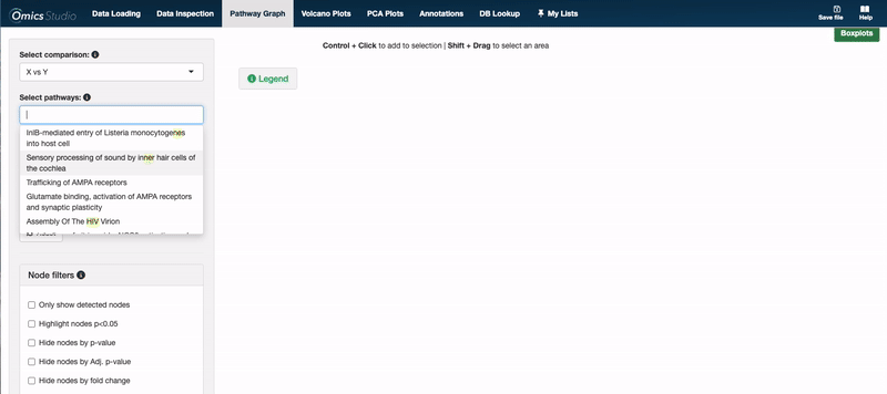 Selecting pathways efficiently is key to leveraging the Pathway graph for in-depth analysis. This feature allows you to load pathways of interest into the Pathway graph, as well as into the Volcano and PCA plots for a analysis.
